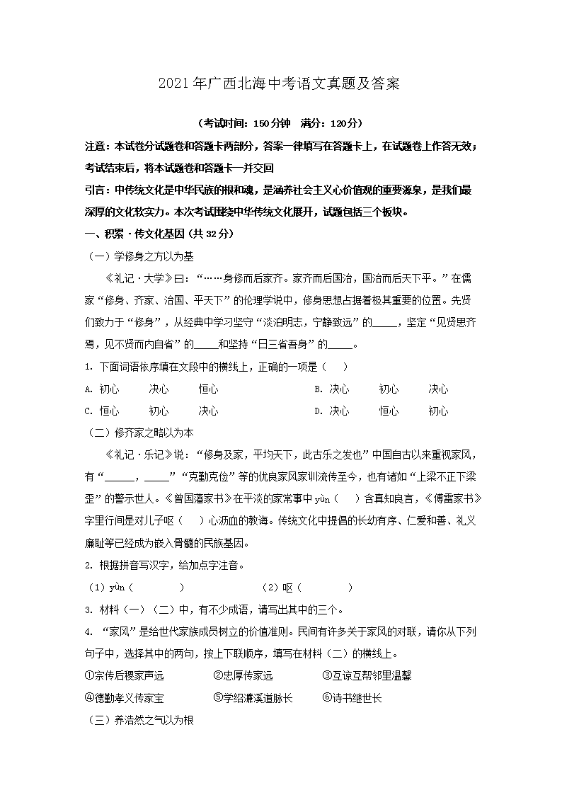 【文档名称】 2021年广西北海中考语文真题及答案(Word版).doc