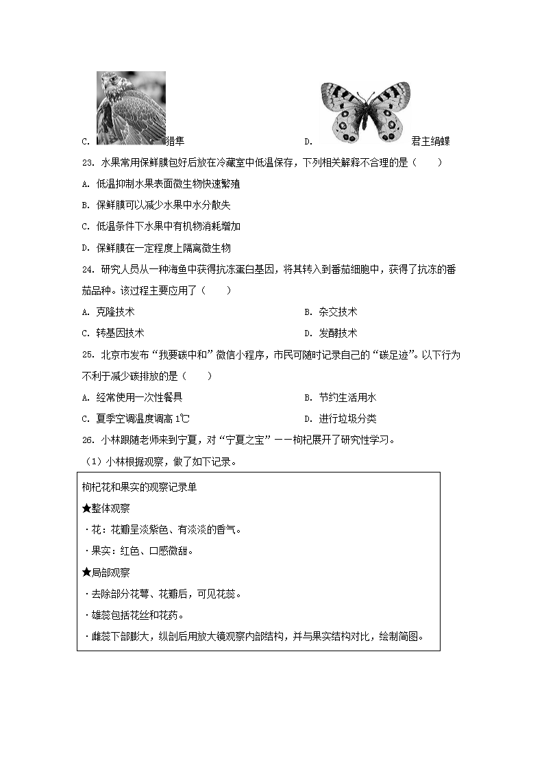 【文档名称】 2021年北京平谷中考生物试题及答案(Word版).doc