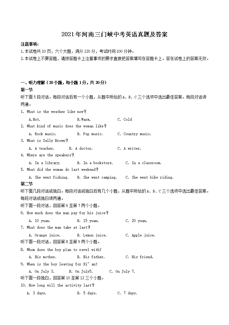 【文档名称】 2021年河南三门峡中考英语真题及答案(Word版).doc