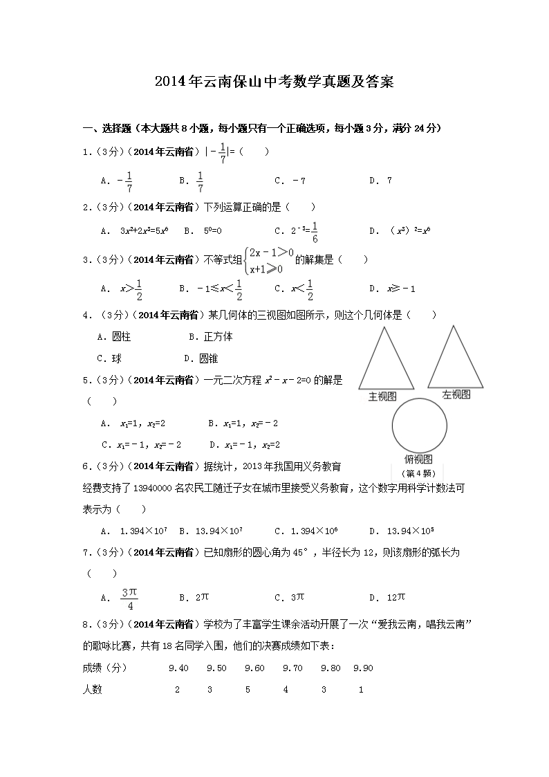 【文档名称】 2014年云南保山中考数学真题及答案(Word版).doc