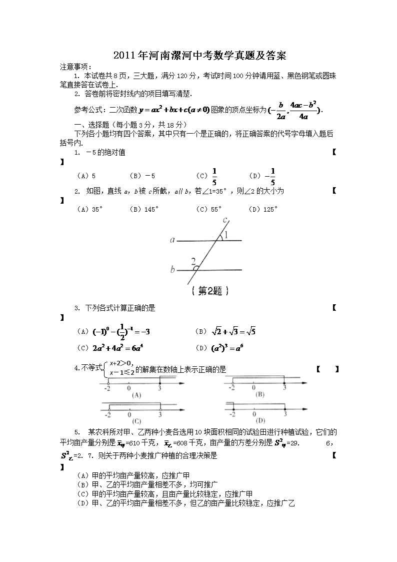 【文档名称】 2011年河南漯河中考数学真题及答案(Word版).doc