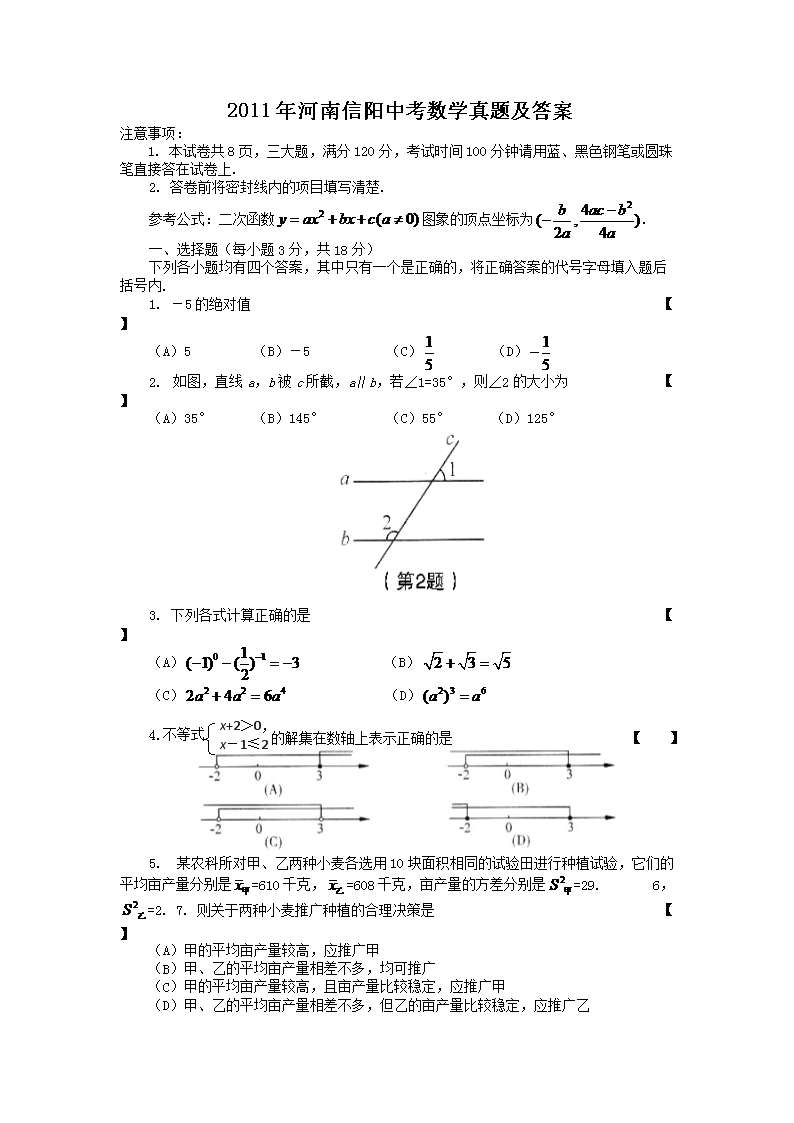 【文档名称】 2011年河南信阳中考数学真题及答案(Word版).doc