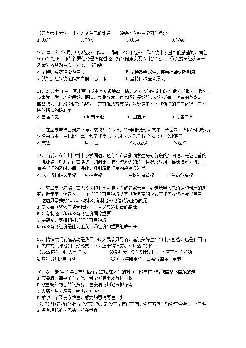 【文档名称】 2013年贵州黔东南州中考思想品德真题及答案(Word版).doc