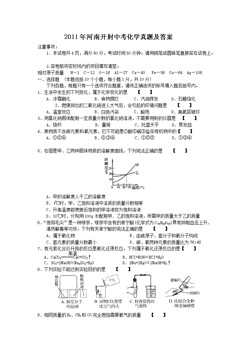 【文档名称】 2011年河南开封中考化学真题及答案(Word版).doc