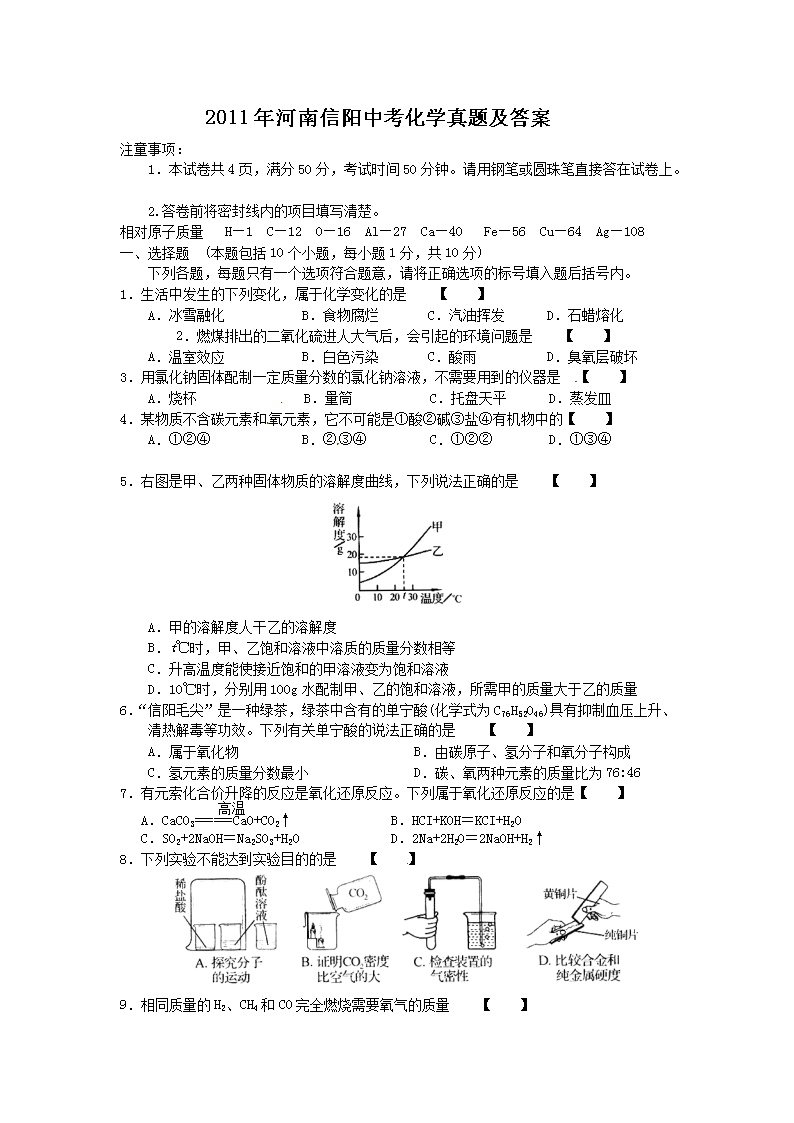 【文档名称】 2011年河南信阳中考化学真题及答案(Word版).doc