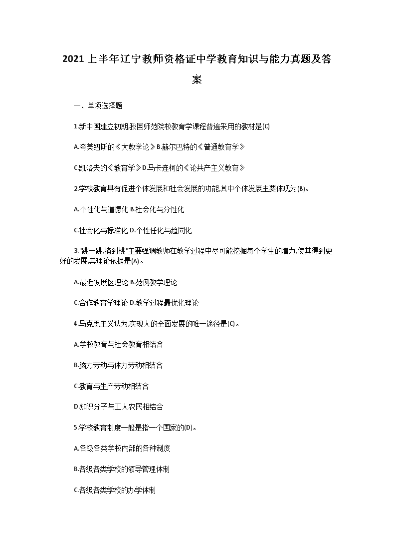 【文档名称】 2021上半年辽宁教师资格证中学教育知识与能力真题及答案(Word版).doc