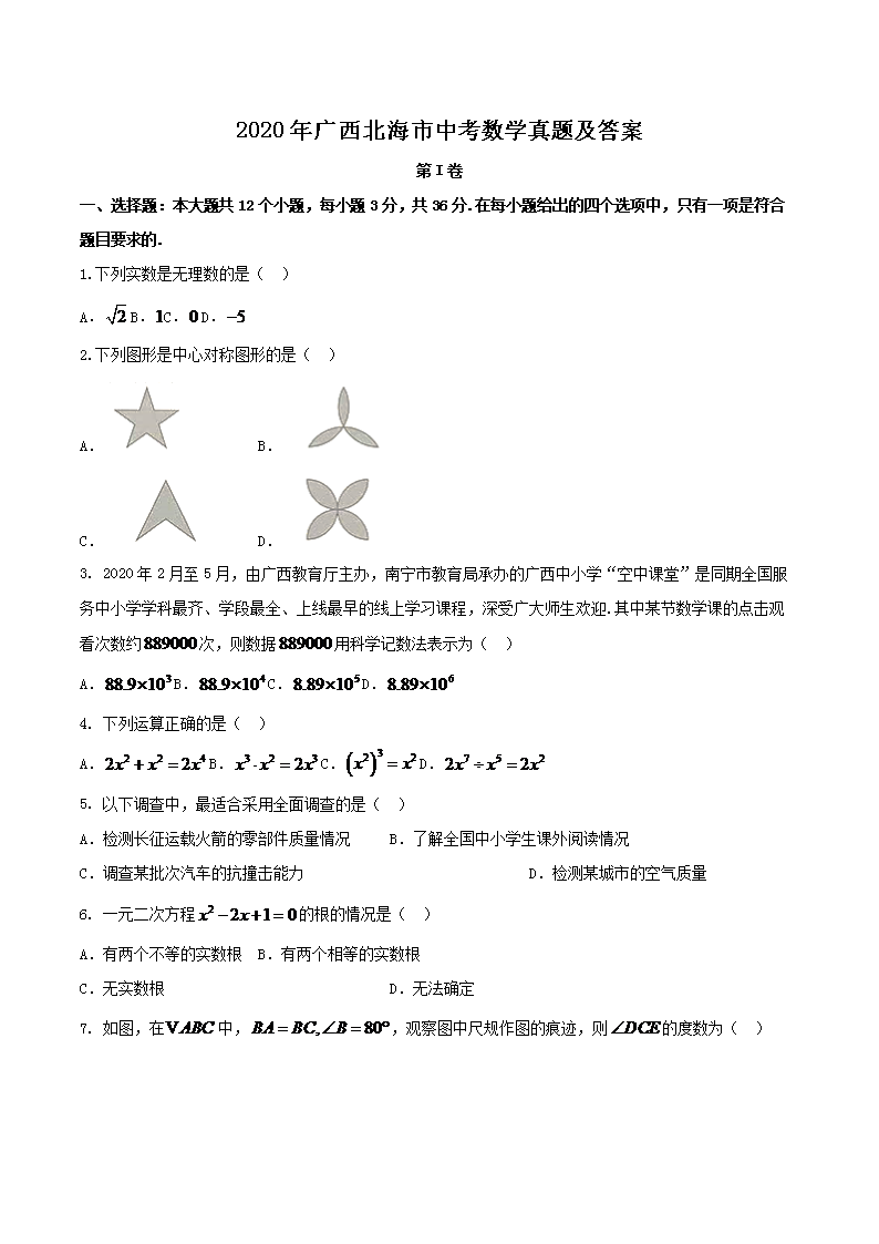 【文档名称】 2020年广西北海市中考数学真题及答案(Word版).doc