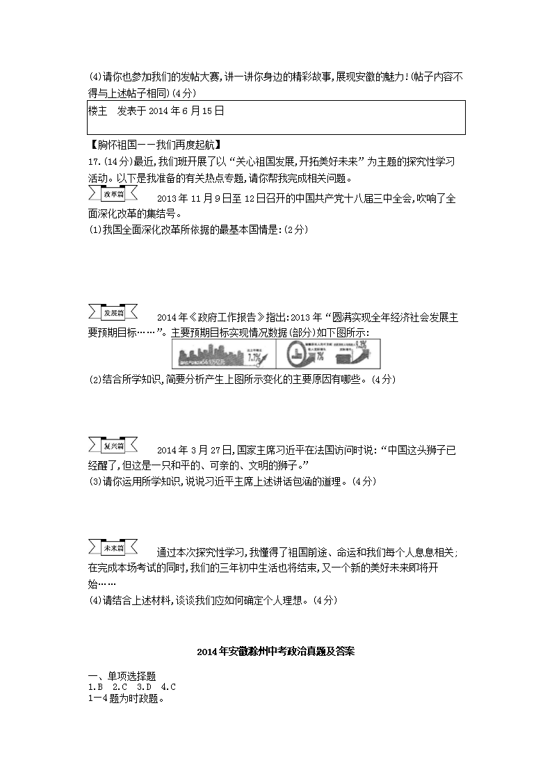 【文档名称】 2014年安徽滁州中考政治真题及答案(Word版).doc