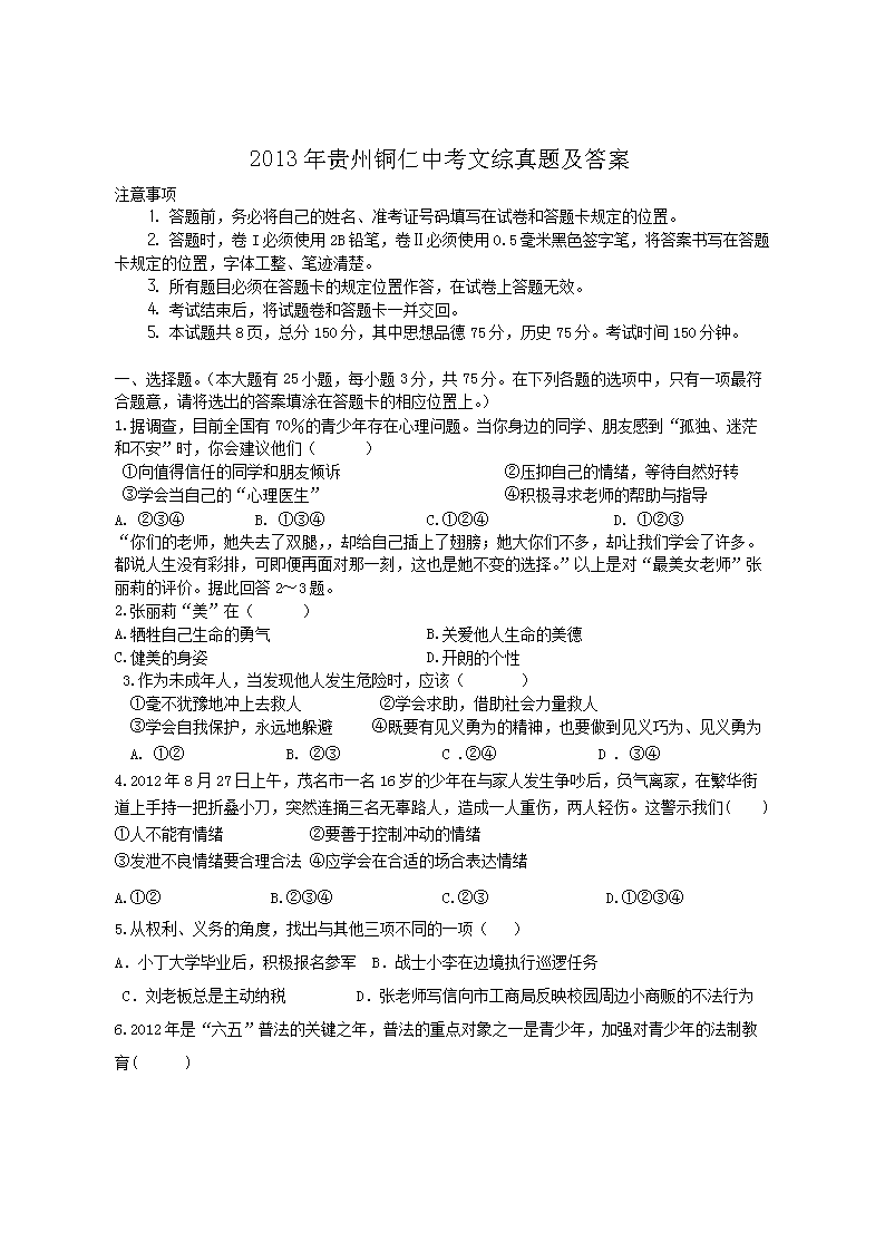 【文档预览】 无忧考网整理发布2013年贵州铜仁中考文综真题及答案(Word版),前五页预览如下: