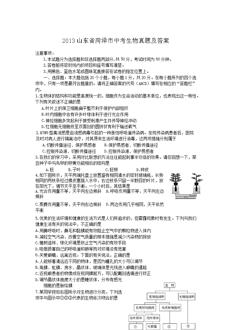 【文档预览】 无忧考网整理发布2013山东省菏泽市中考生物真题及答案(Word版),前五页预览如下: