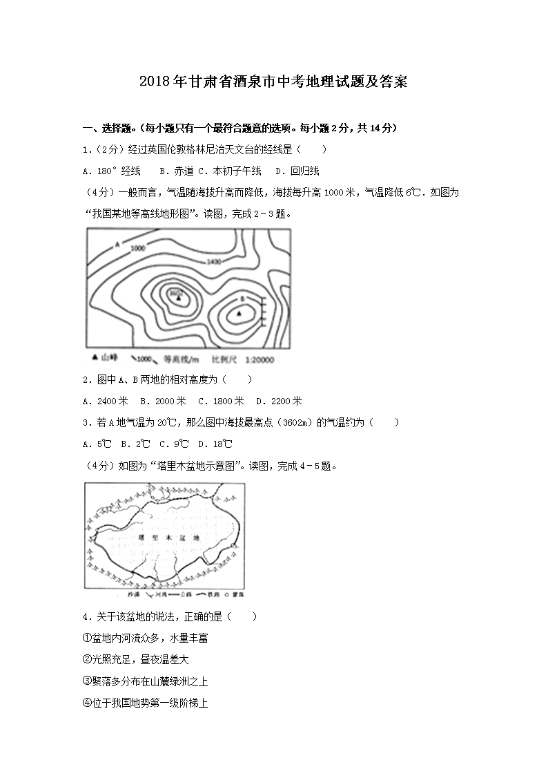 【文档预览】 无忧考网整理发布2018年甘肃省酒泉市中考地理试题及答案(Word版),前五页预览如下: