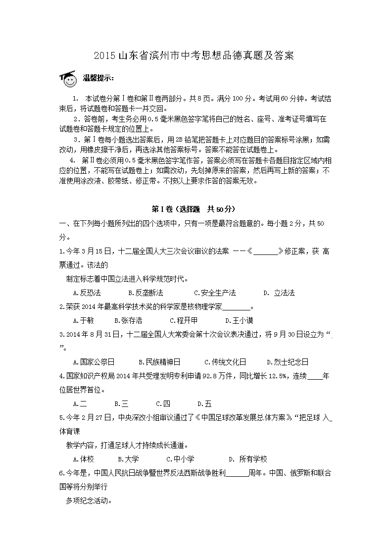 【文档预览】 无忧考网整理发布2015山东省滨州市中考思想品德真题及答案(Word版),前五页预览如下: