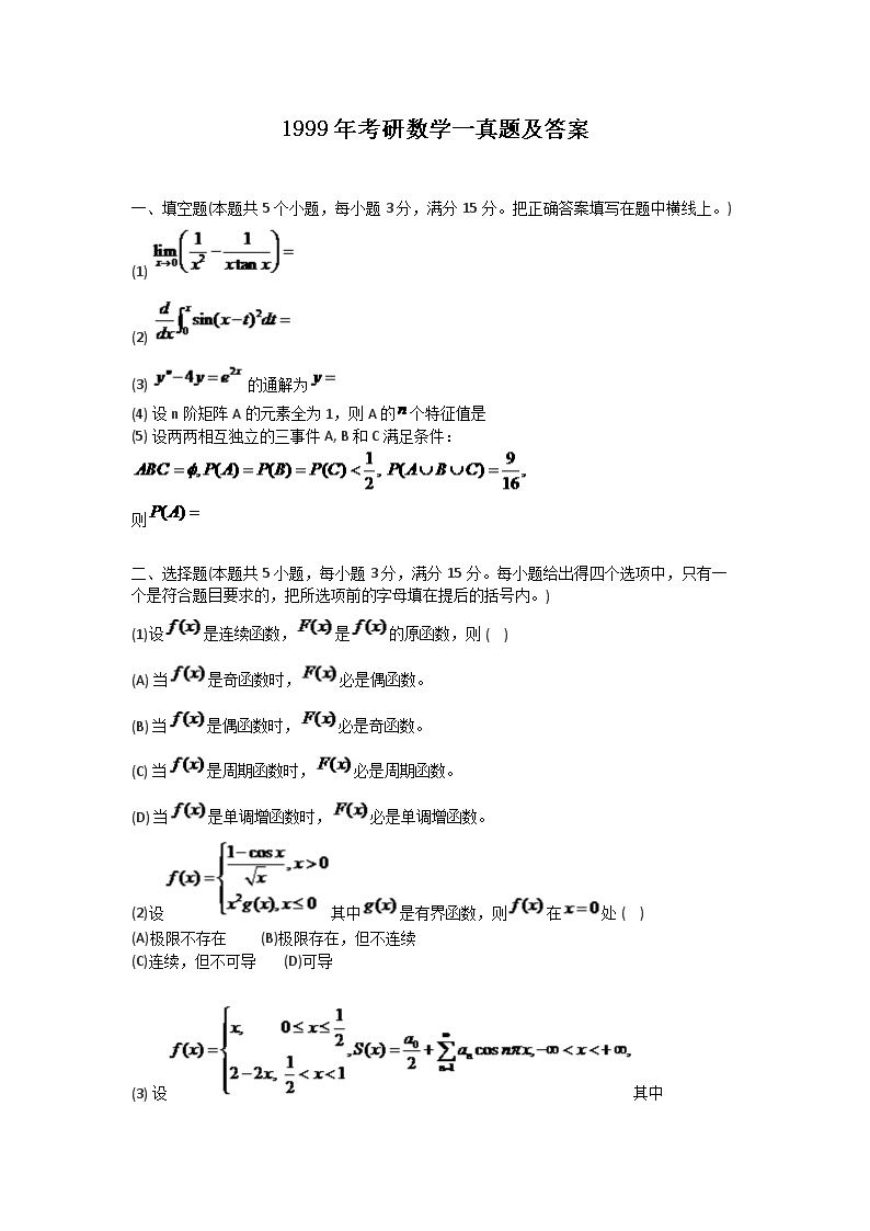 【文档名称】 1999年考研数学一真题及答案(Word版).doc