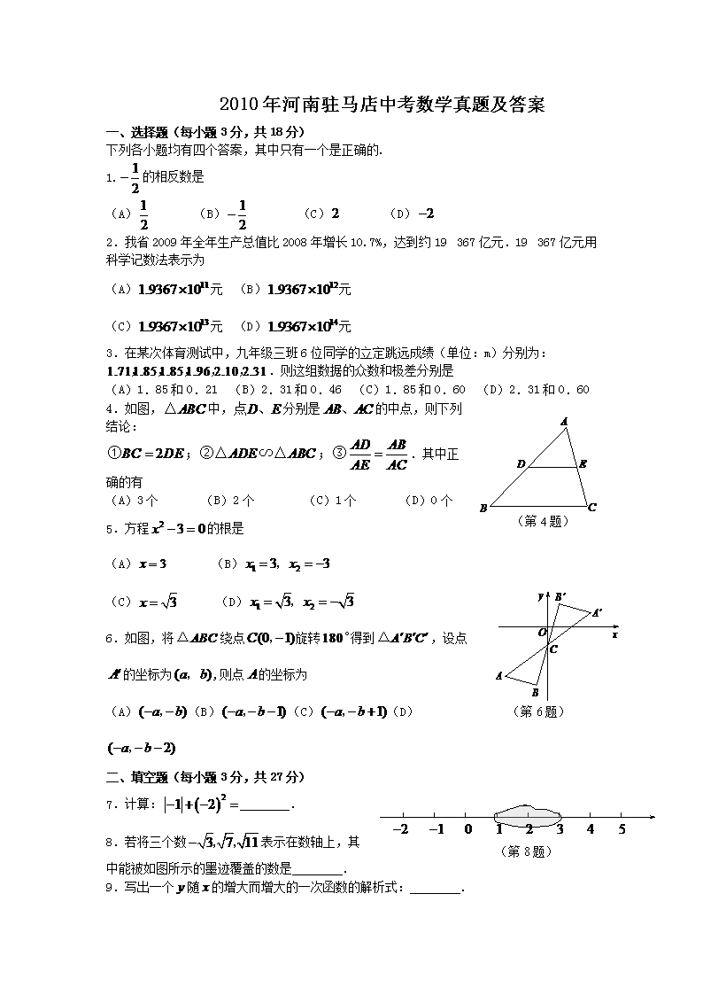 【文档名称】 2010年河南驻马店中考数学真题及答案(Word版).doc