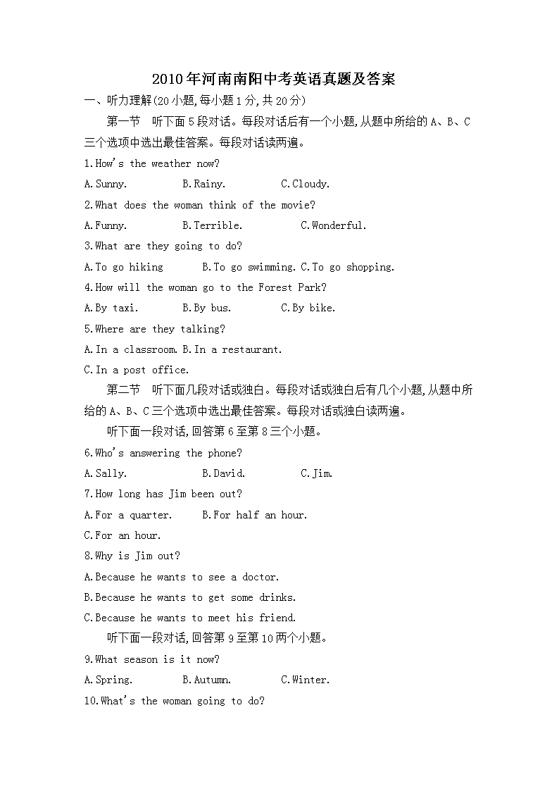 【文档名称】 2010年河南南阳中考英语真题及答案(Word版).doc