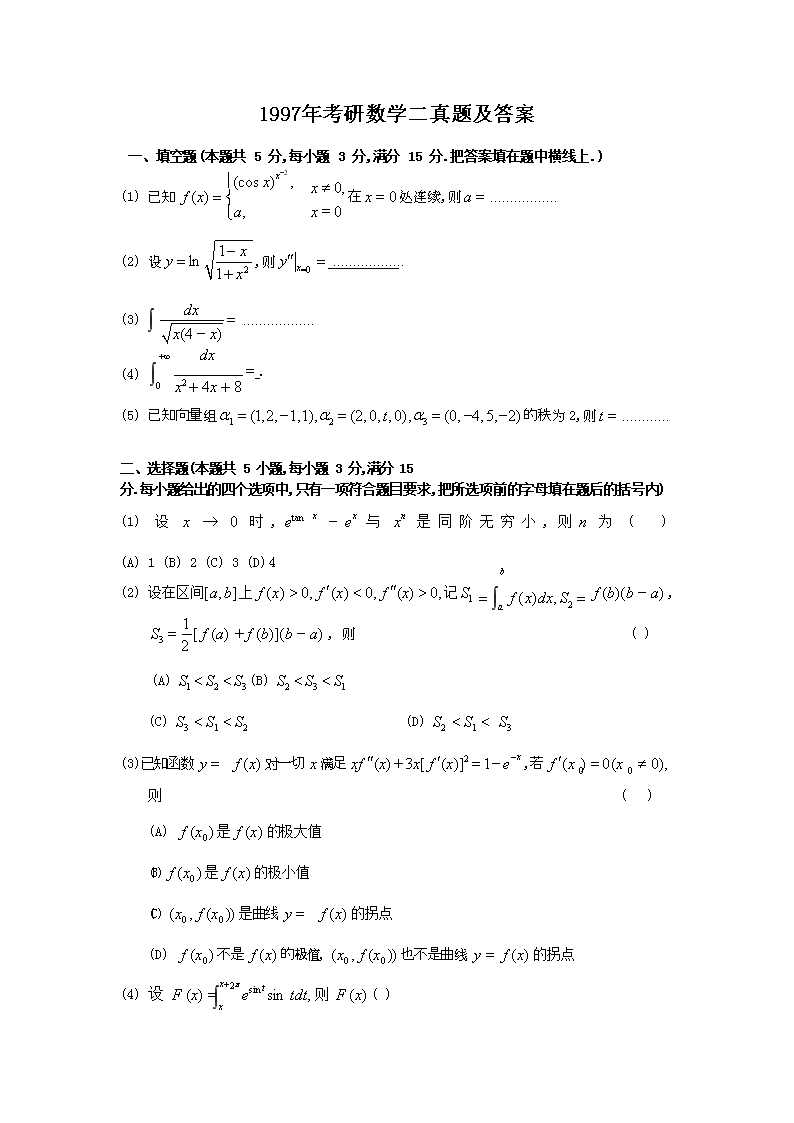 【文档名称】 1997年考研数学二真题及答案(Word版).doc