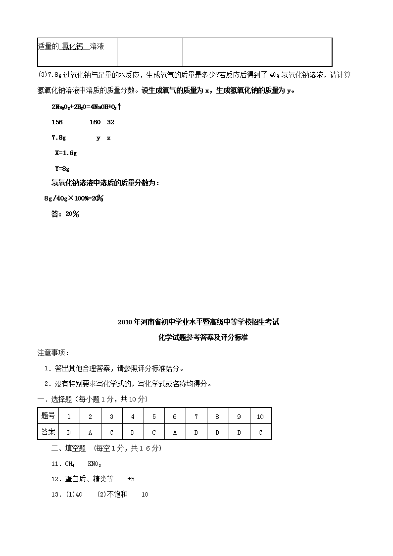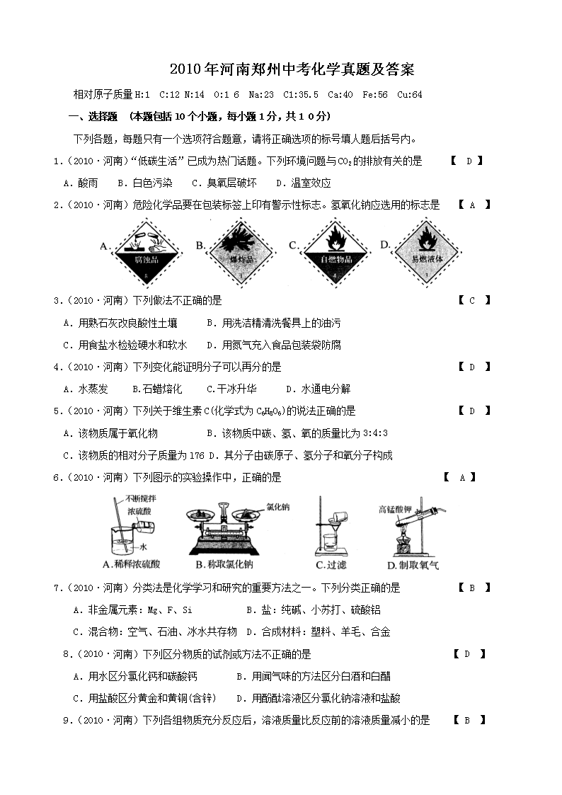 【文档名称】 2010年河南郑州中考化学真题及答案(Word版).doc
