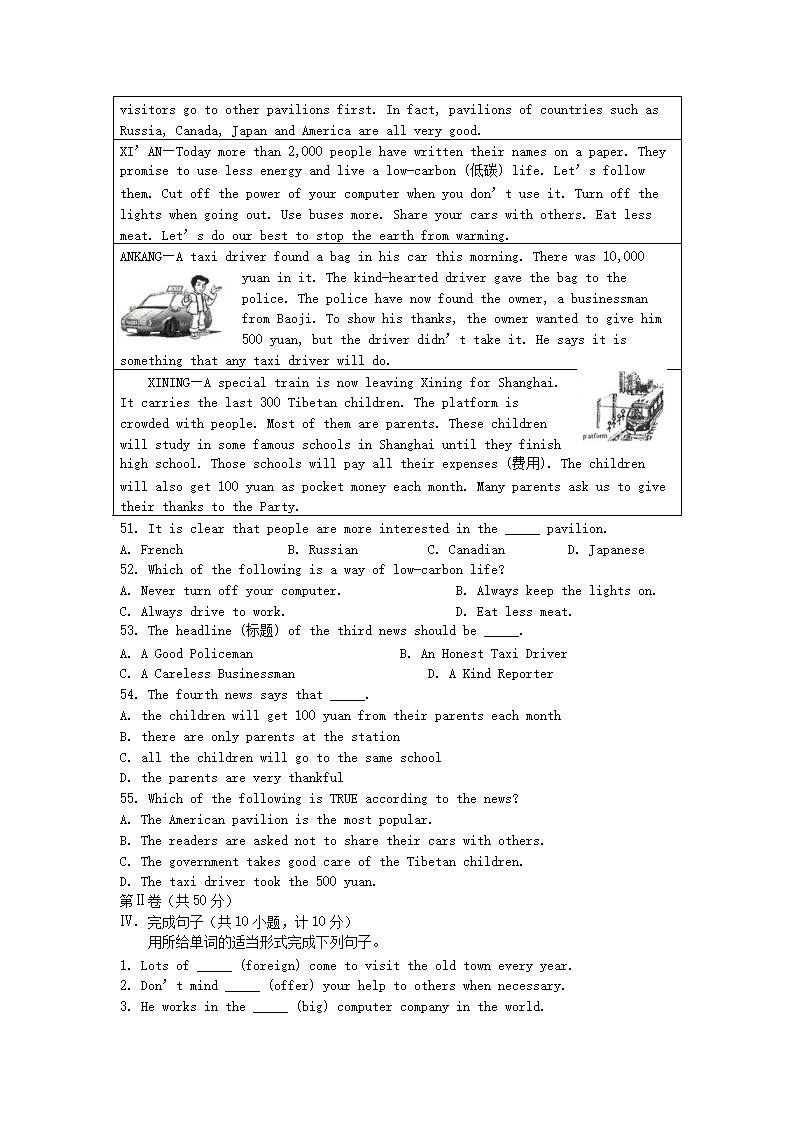【文档预览】 无忧考网整理发布2010年陕西省铜川中考英语真题及答案(Word版),前五页预览如下: