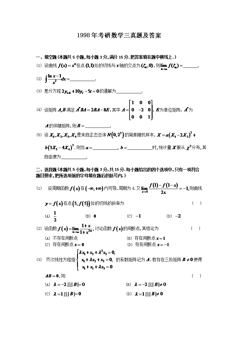 【文档名称】 1998年考研数学三真题及答案(Word版).doc