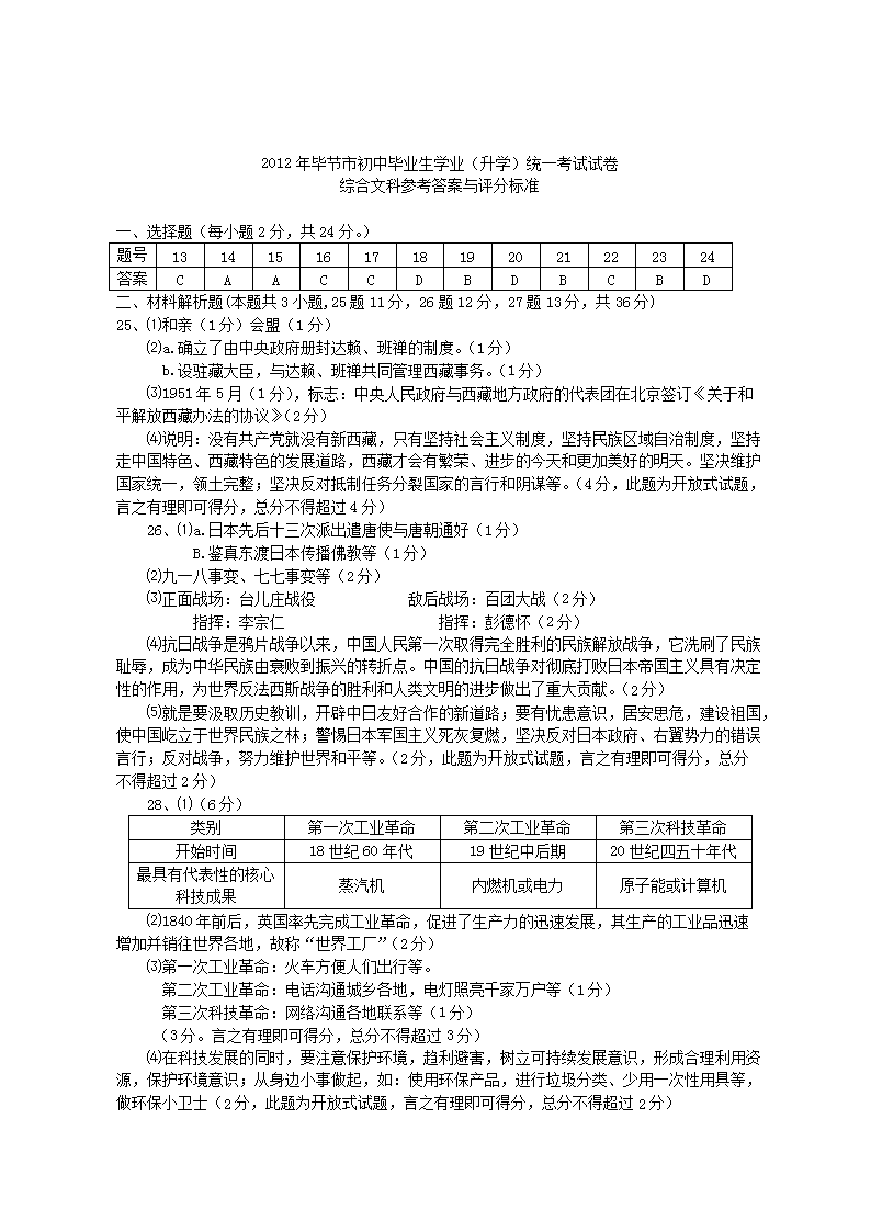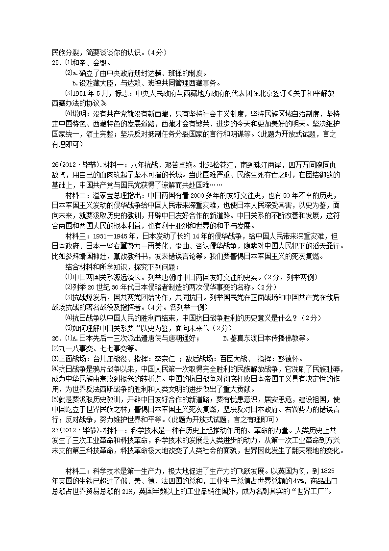 【文档名称】 2012年贵州毕节市中考历史真题及答案(Word版).doc