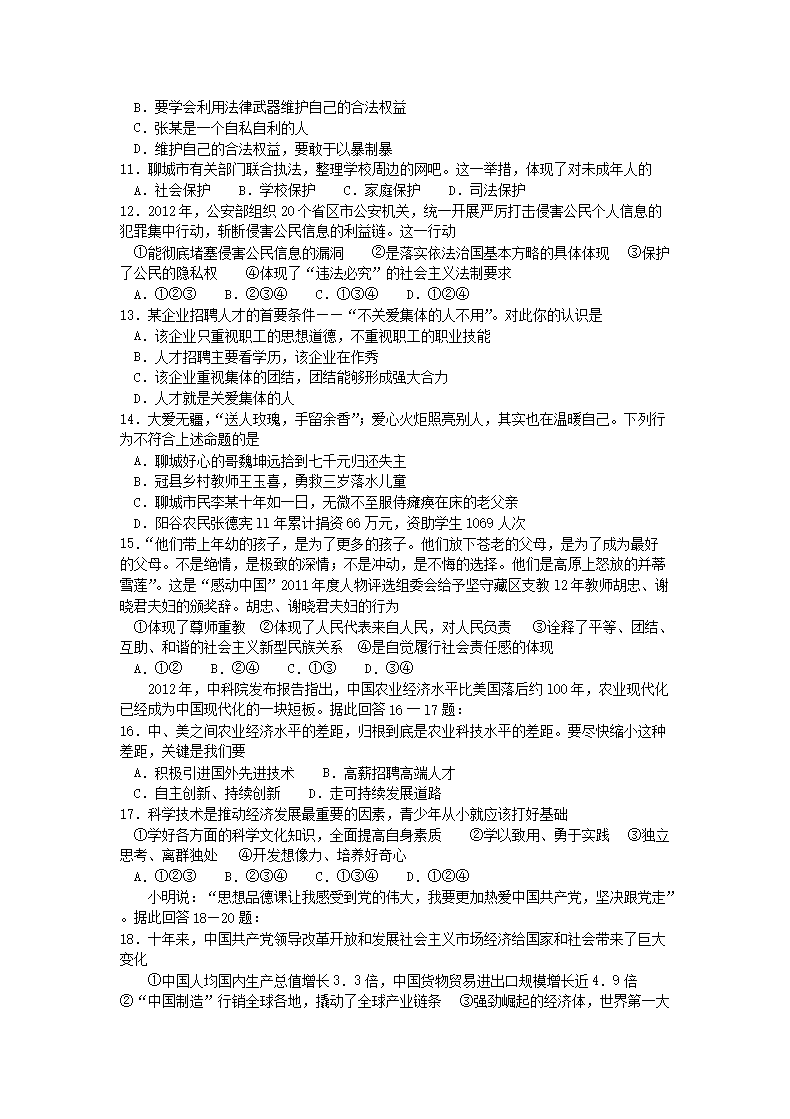 【文档名称】 2012山东省聊城市中考思想品德真题及答案(Word版).doc