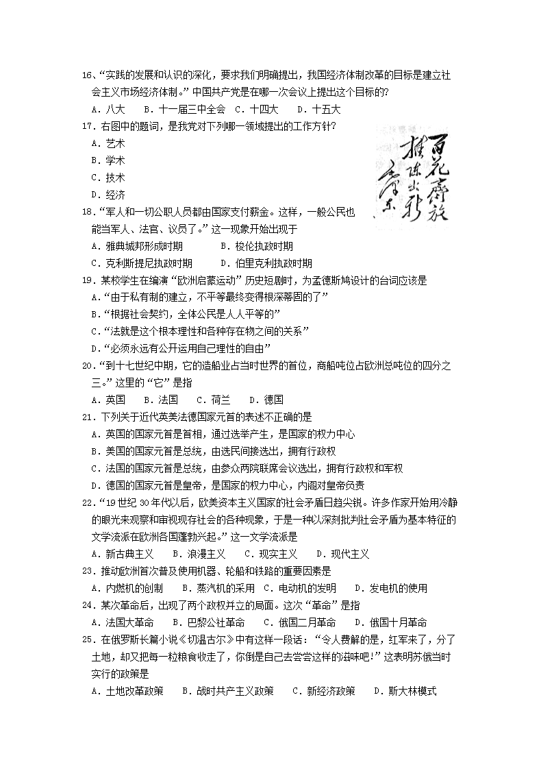 【文档名称】 2011年江苏常州普通高中会考历史真题及答案(Word版).doc