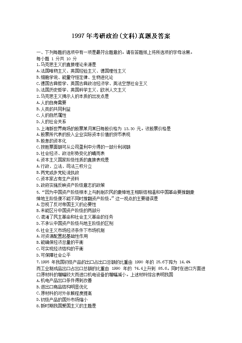【文档名称】 1997年考研政治(文科)真题及答案(Word版).doc