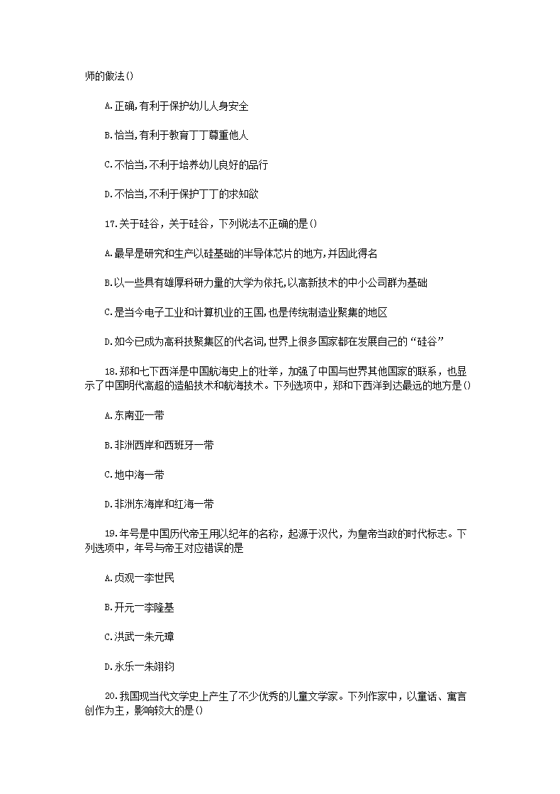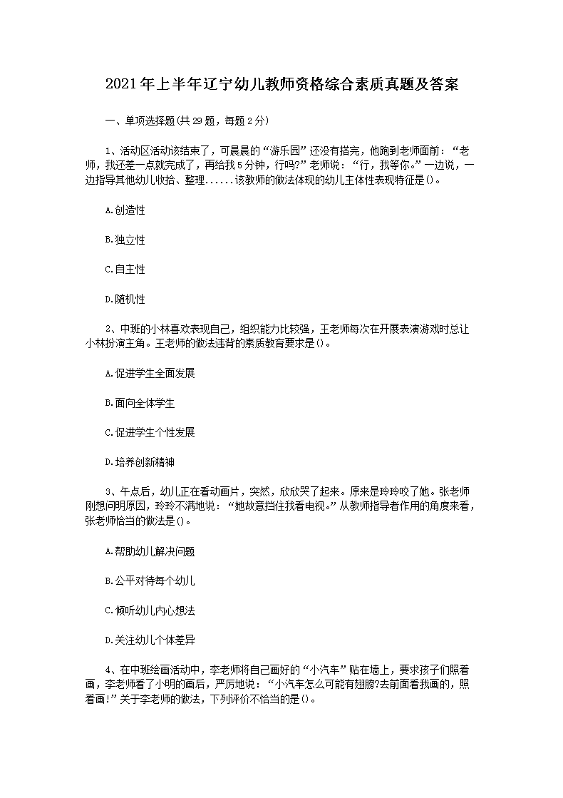 【文档预览】 无忧考网整理发布2021年上半年辽宁幼儿教师资格综合素质真题及答案(Word版),前五页预览如下: