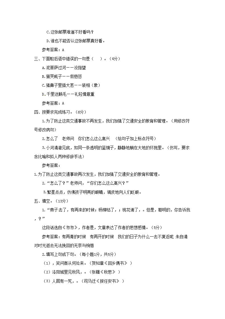 【文档名称】 2020年天津小升初语文真题及答案(Word版).doc