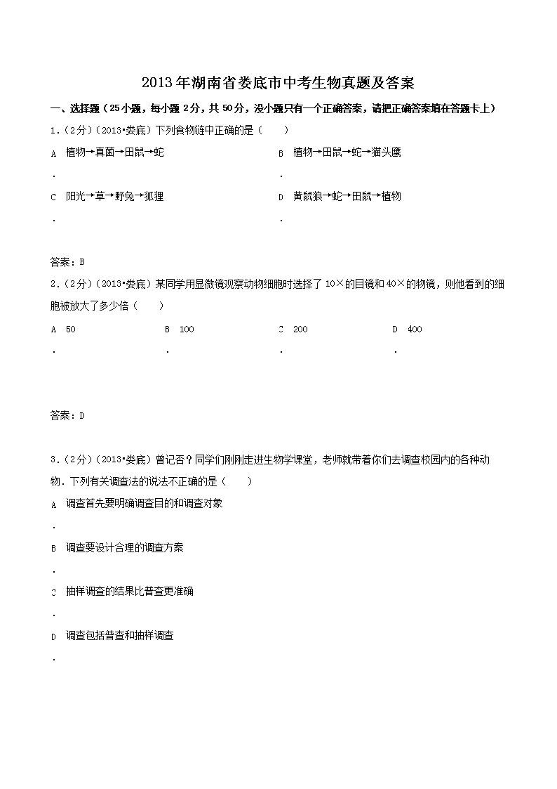 【文档预览】 无忧考网整理发布2013年湖南省娄底市中考生物真题及答案(Word版),前五页预览如下:
