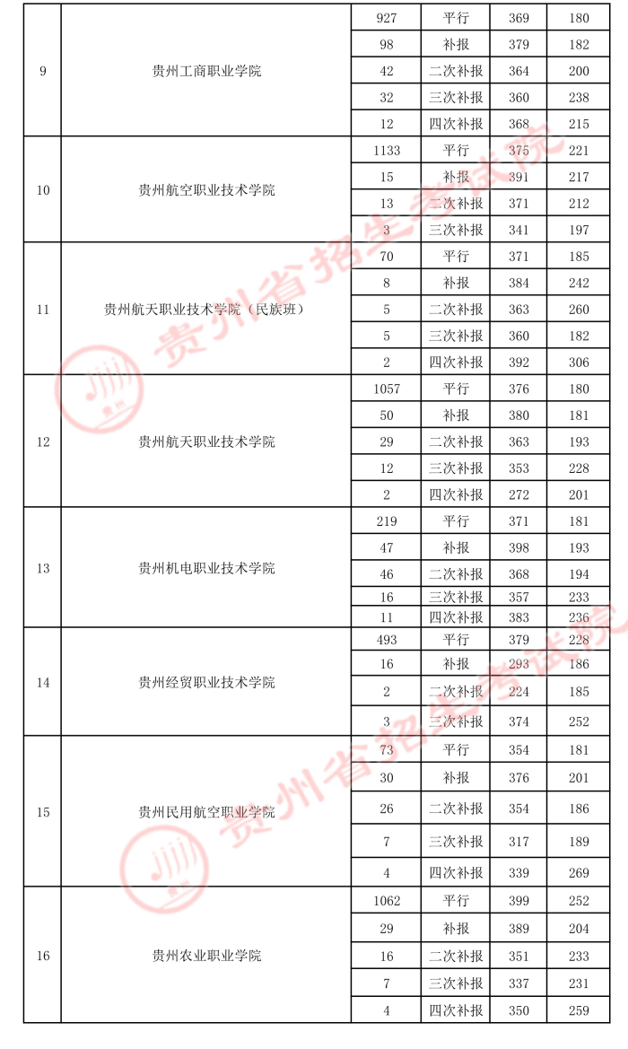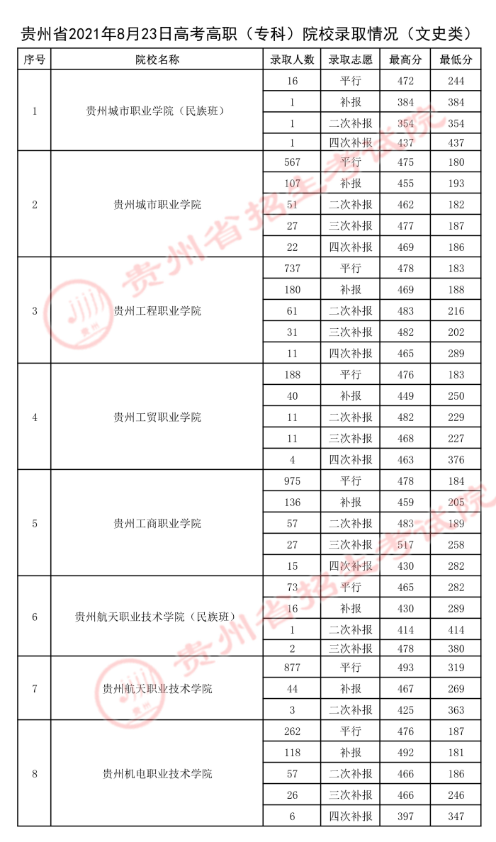 2021年贵州8月23日高考高职(专科)院校录取情况