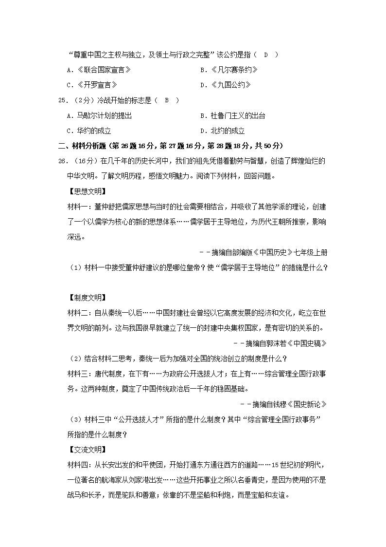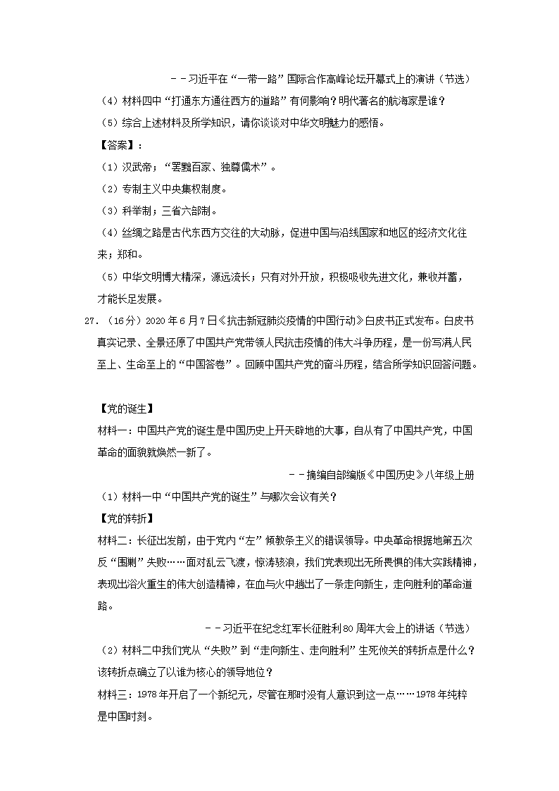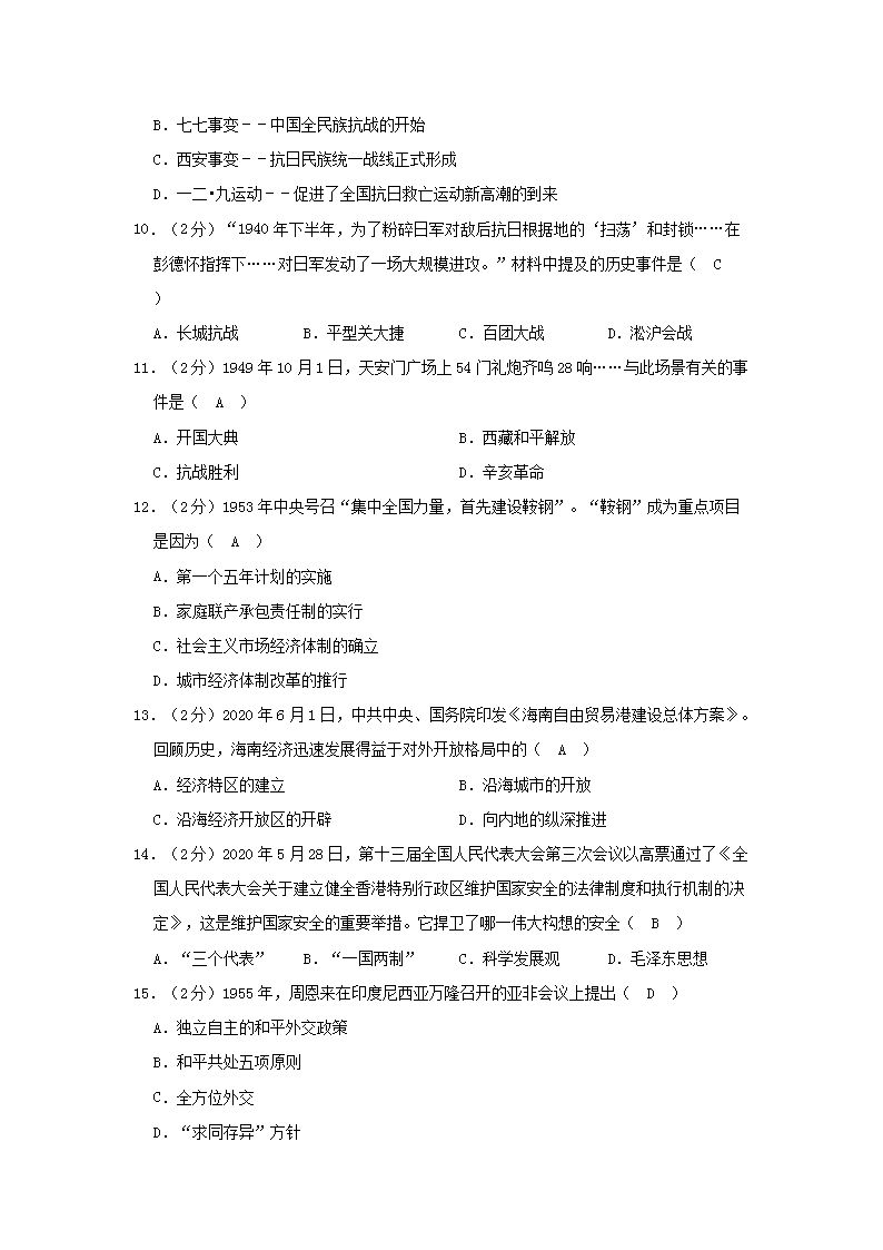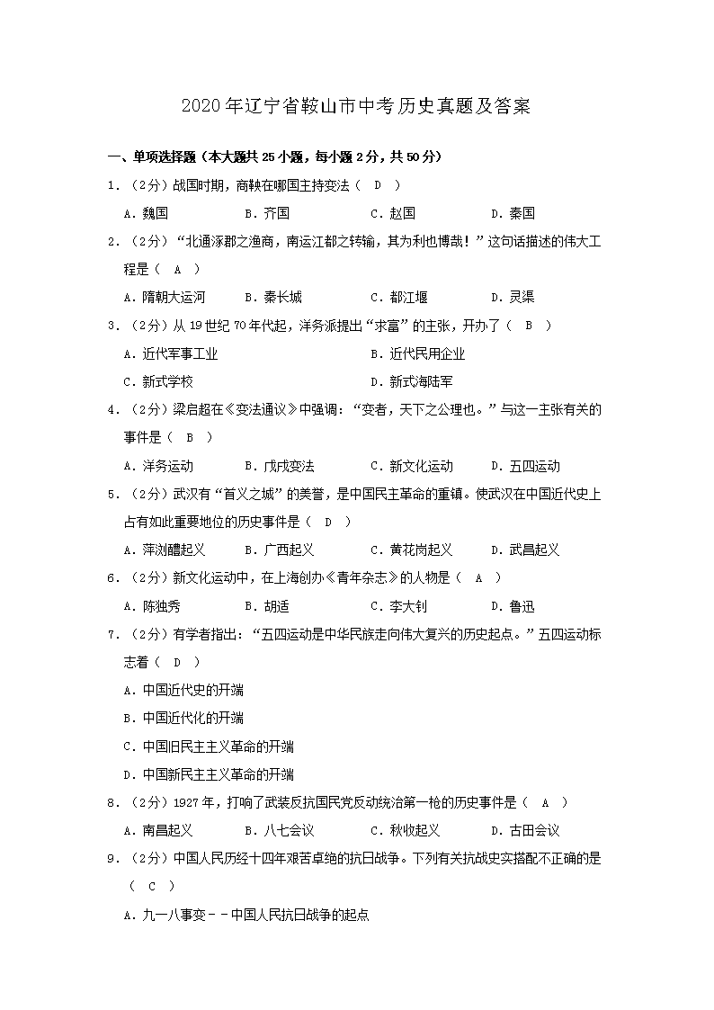 【文档名称】 2020年辽宁省鞍山市中考历史真题及答案(Word版).doc