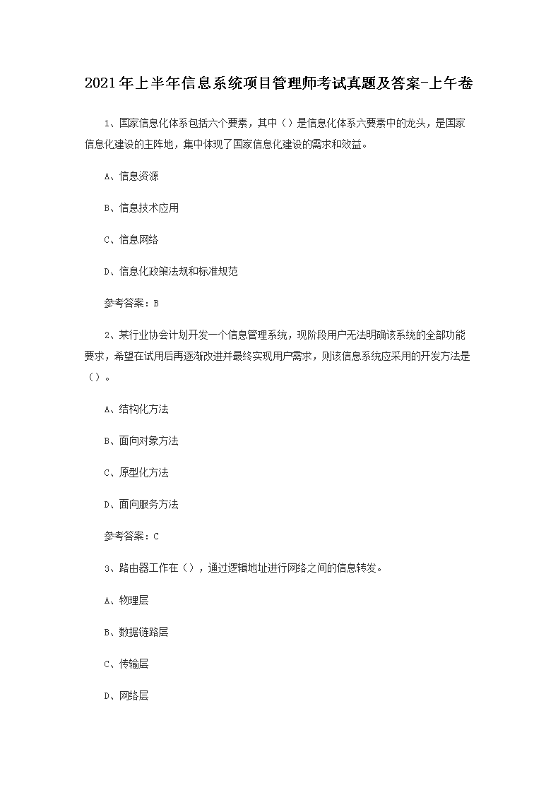 【文档预览】 无忧考网整理发布2021年上半年信息系统项目管理师考试真题及答案-上午卷(Word版),前五页预览如下:
