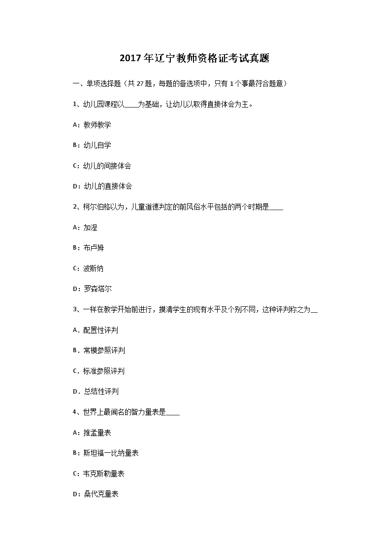 【文档名称】 2017年辽宁教师资格证考试真题(Word版).doc