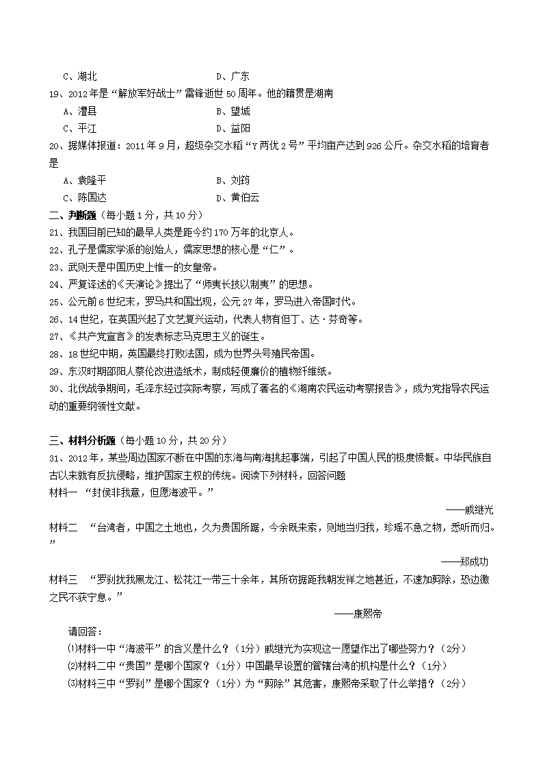 【文档预览】 无忧考网整理发布2012年湖南省湘潭市中考历史真题及答案(Word版),前五页预览如下: