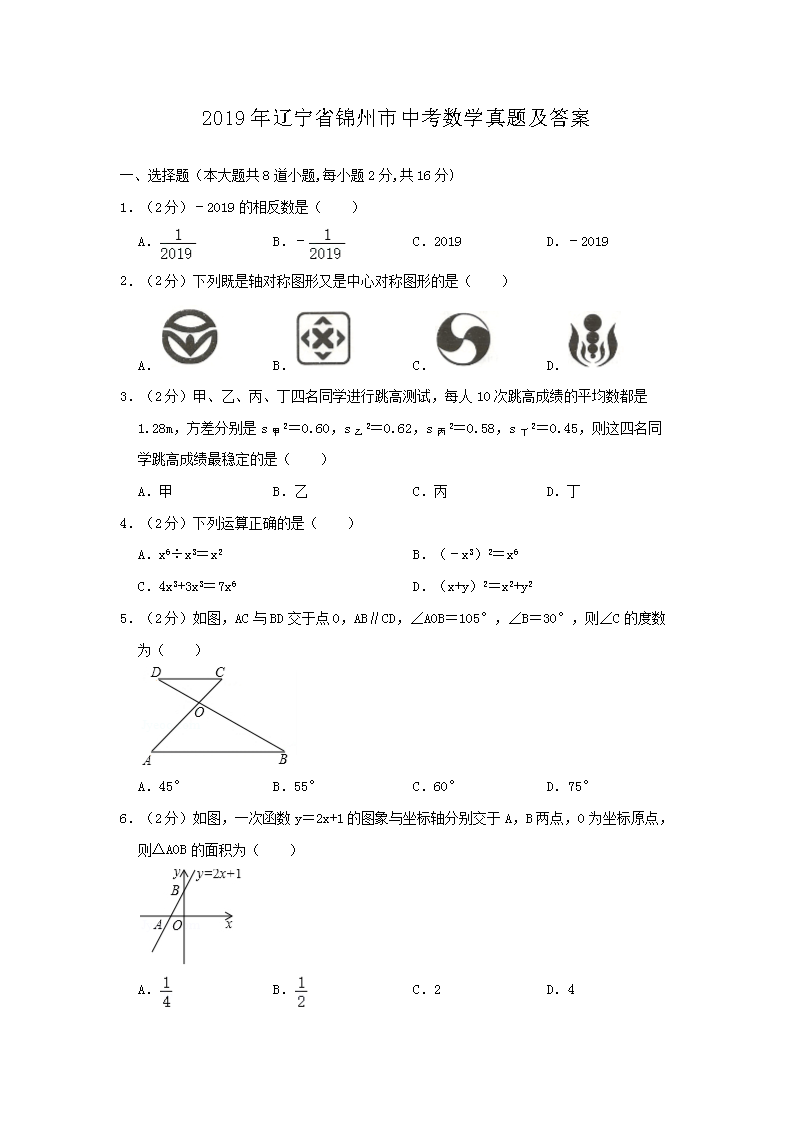 【文档名称】 2019年辽宁省锦州市中考数学真题及答案(Word版).doc