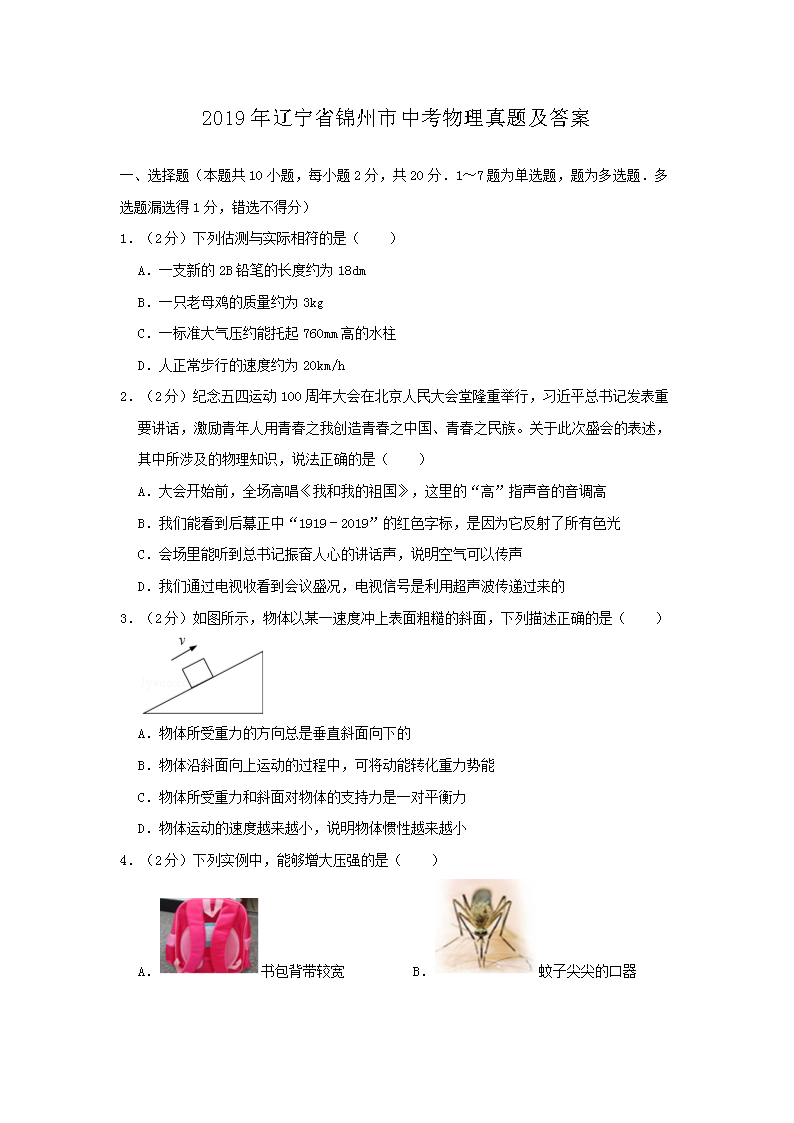 【文档预览】 无忧考网整理发布2019年辽宁省锦州市中考物理真题及答案(Word版),前五页预览如下:
