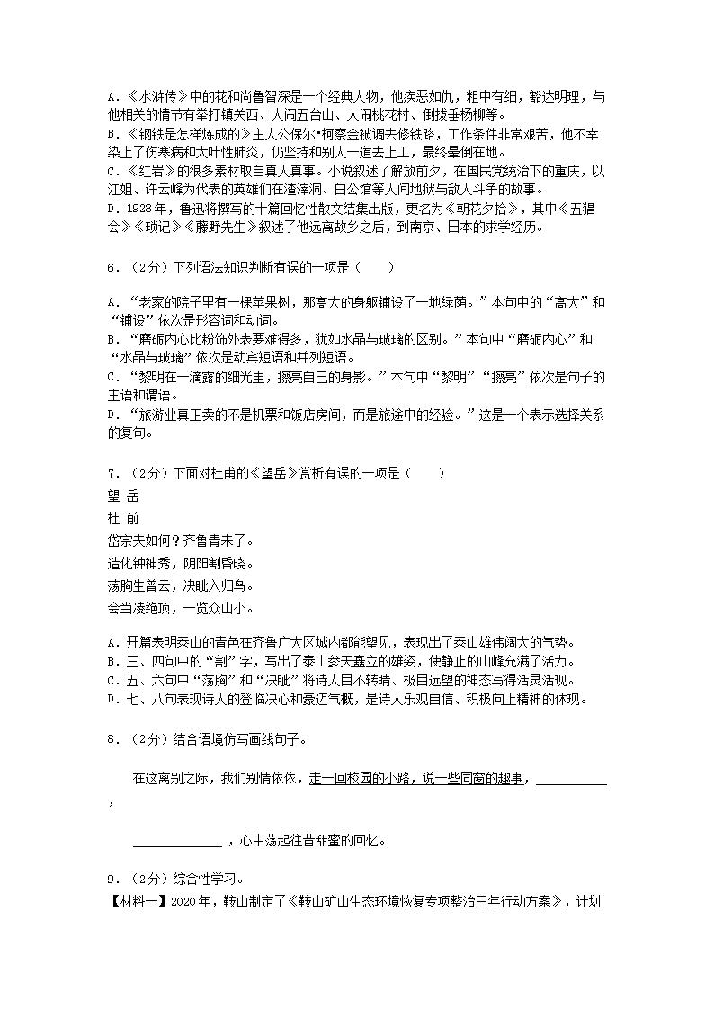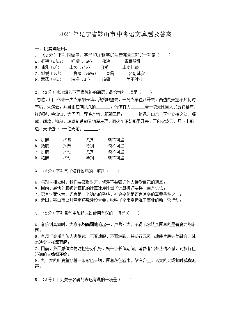 【文档名称】 2021年辽宁省鞍山市中考语文真题及答案(Word版).doc