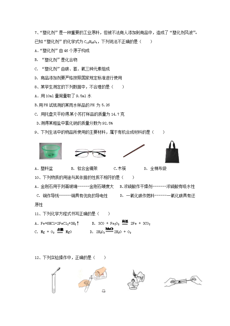 【文档名称】 2012年云南文山中考化学真题及答案(Word版).doc