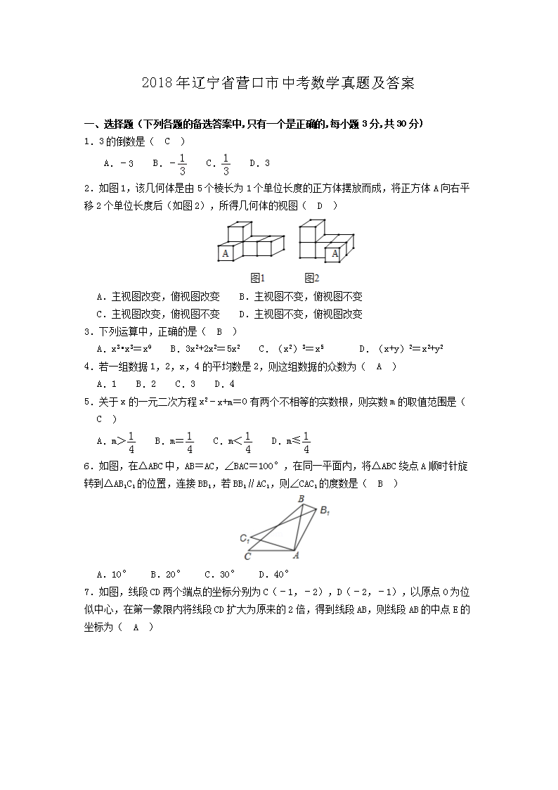【文档名称】 2018年辽宁省营口市中考数学真题及答案(Word版).doc