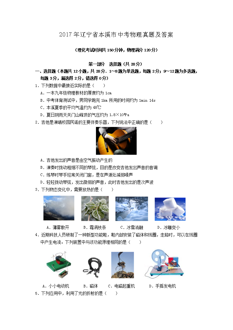 【文档预览】 无忧考网整理发布2017年辽宁省本溪市中考物理真题及答案(Word版),前五页预览如下: