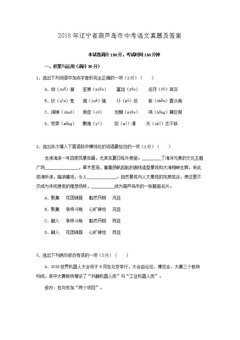 【文档名称】 2018年辽宁省葫芦岛市中考语文真题及答案(Word版).doc