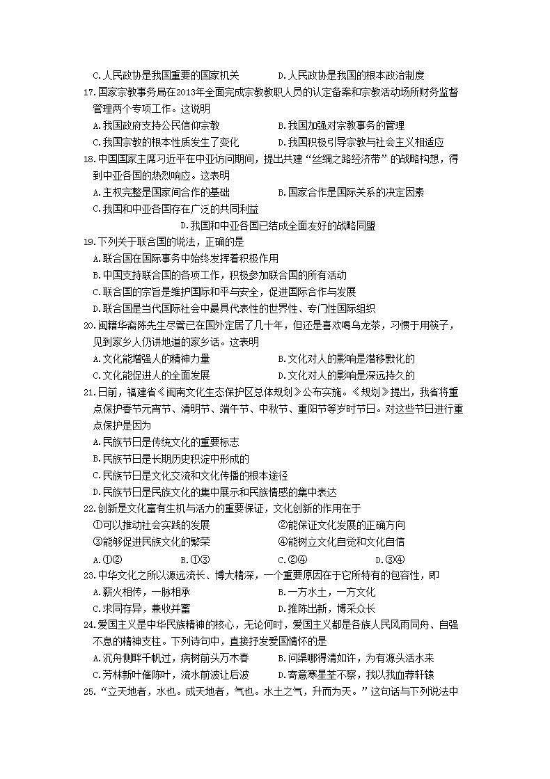 【文档名称】 2014年福建普通高中会考政治真题及答案(Word版).doc