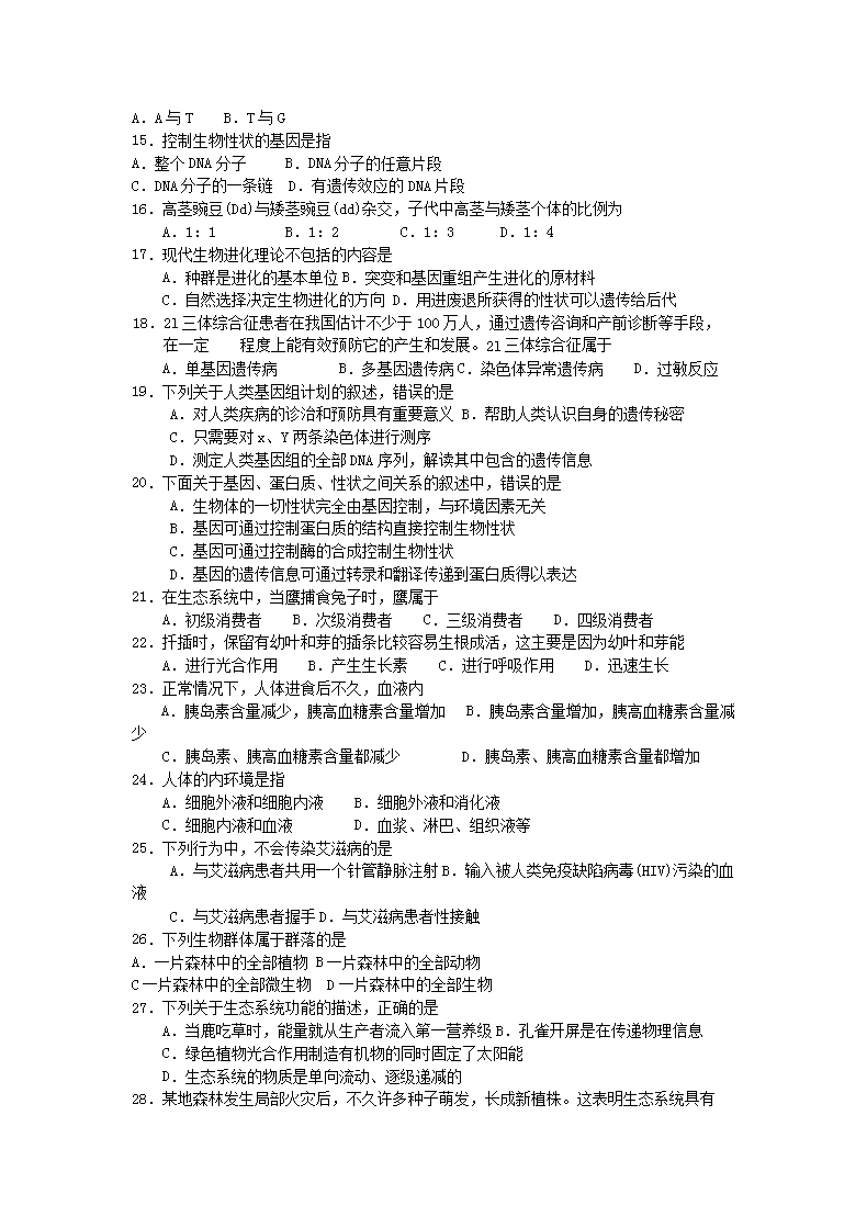 【文档名称】 2008年福建普通高中会考生物真题及答案(Word版).doc