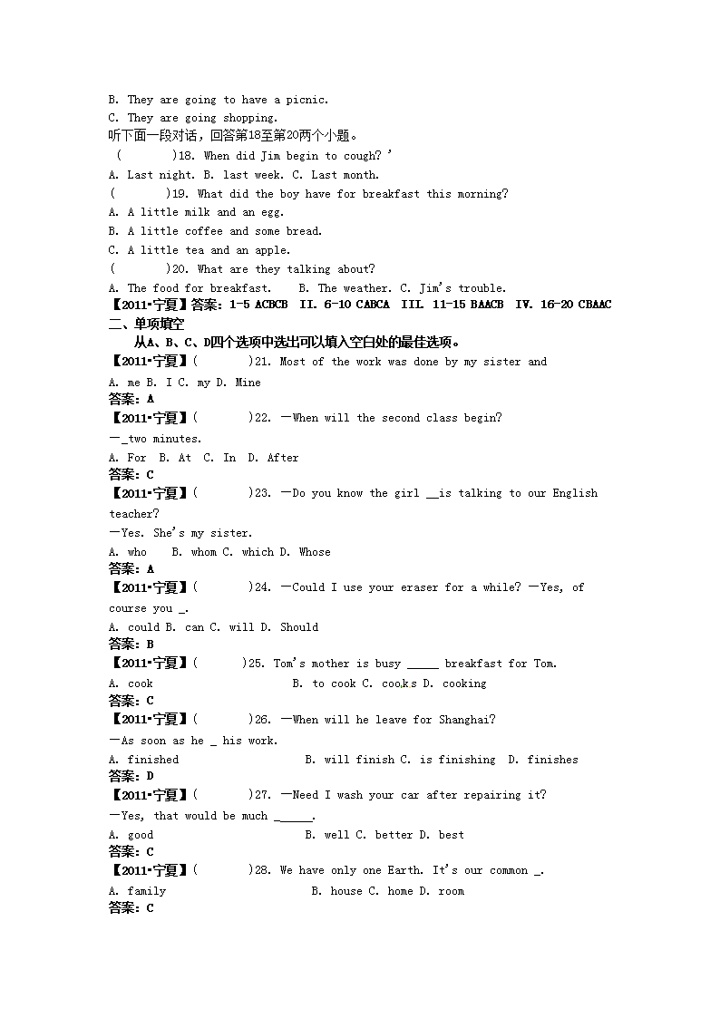 【文档预览】 无忧考网整理发布2011年宁夏石嘴山中考英语真题及答案(Word版),前五页预览如下: