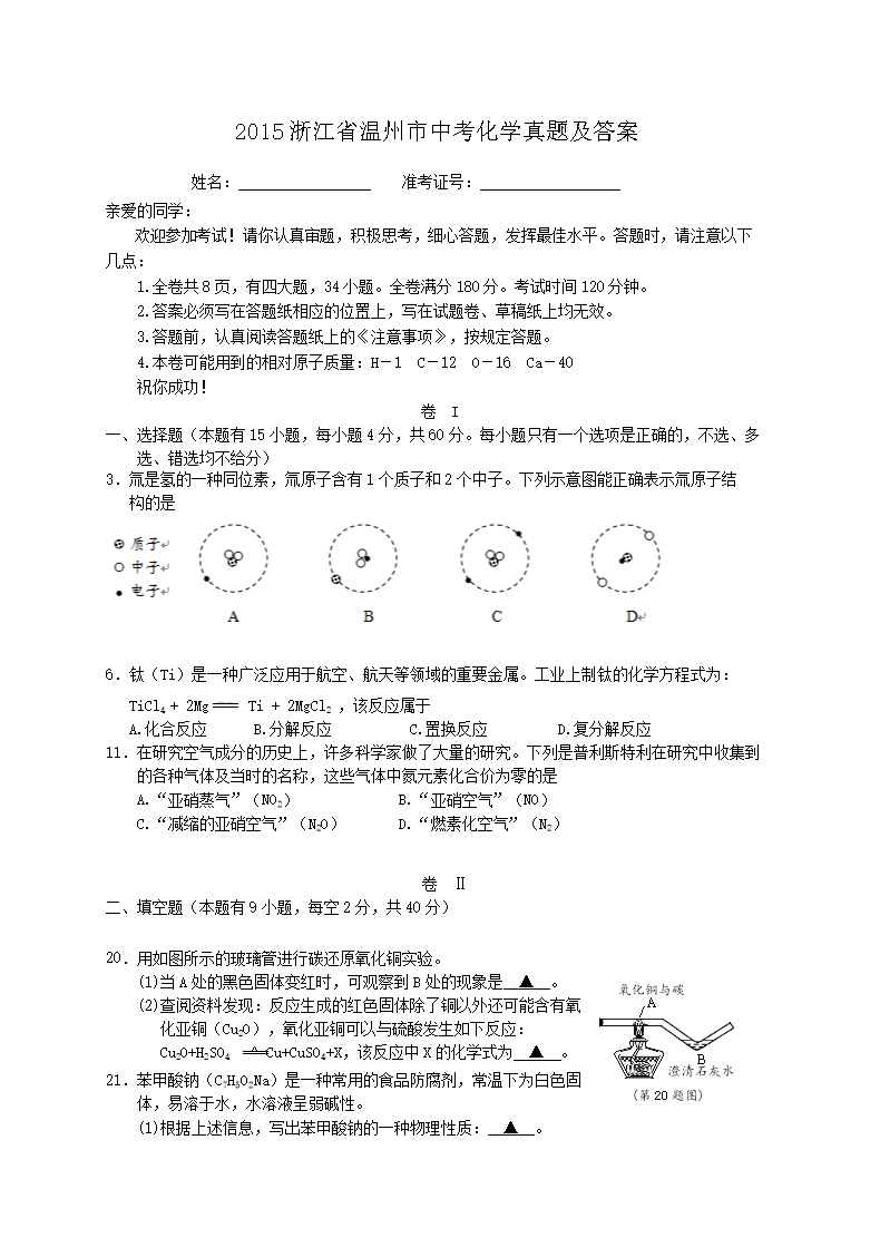 【文档预览】 无忧考网整理发布2015浙江省温州市中考化学真题及答案(Word版),前五页预览如下: