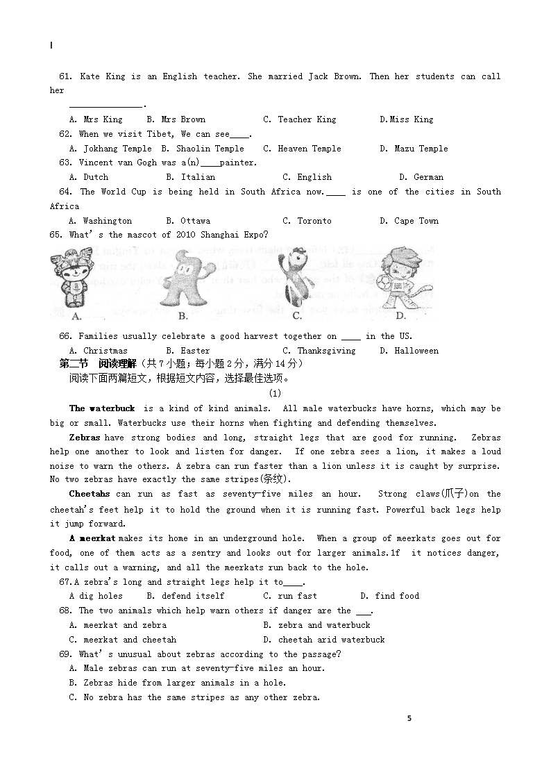 【文档预览】 无忧考网整理发布2010年湖北省黄冈市中考英语真题及答案(Word版),前五页预览如下: