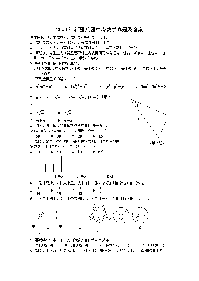 【文档名称】 2009年新疆兵团中考数学真题及答案(Word版).doc
