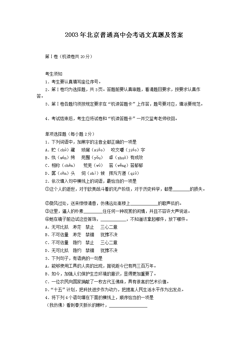 【文档预览】 无忧考网整理发布2003年北京普通高中会考语文真题及答案(Word版),前五页预览如下: