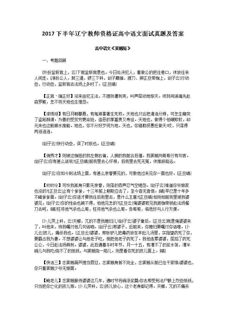 【文档名称】 2017下半年辽宁教师资格证高中语文面试真题及答案(Word版).doc